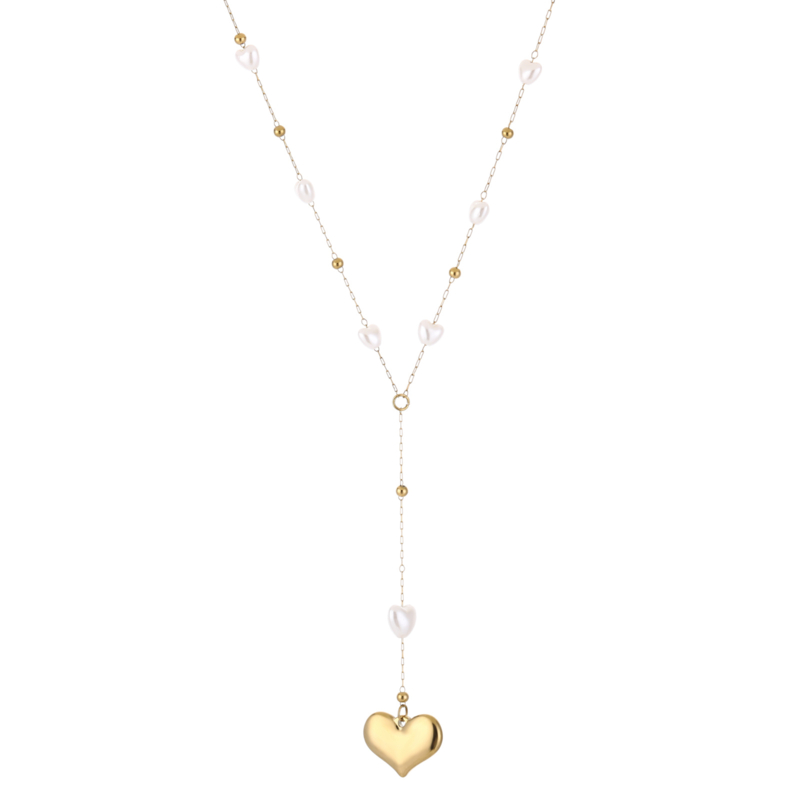 Deze goudkleurige ketting met hartje en pareltjes straalt pure elegantie en romantiek uit. De fijne schakel is subtiel afgewerkt met kleine witte parel details en goudkleurige accenten, wat de ketting een verfijnde en vrouwelijke uitstraling geeft. Het glanzende hartje vormt het middelpunt en maakt dit sieraad extra bijzonder.